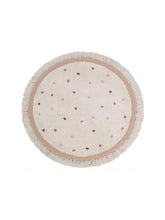 Laat u betoveren door dit prachtige ronde beige vloerkleed met okerkleurige en roze stippen, de parel die ontbrak in de decoratie van de kamer van uw kleine prinses!